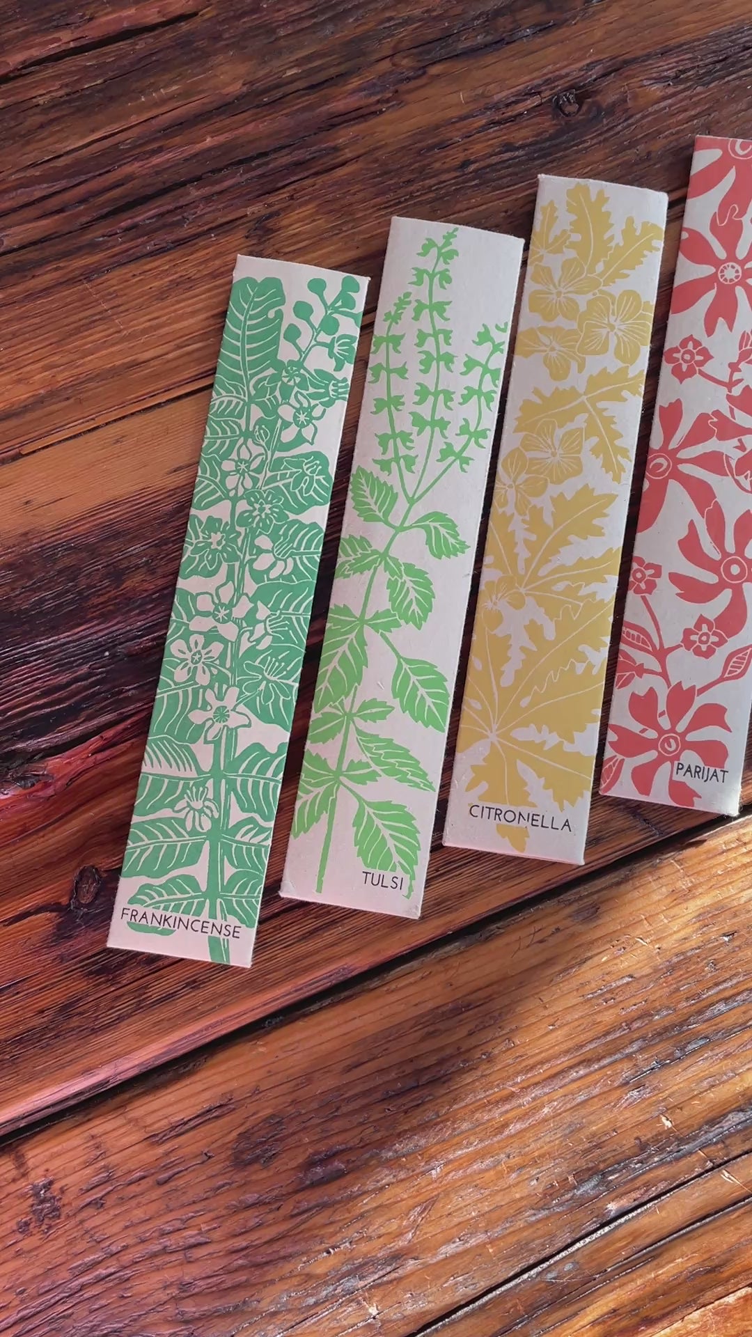 The incense sticks are made from pure, natural ingredients- bamboo sticks, wood powder, Jiggit gum (a natural adhesive made from the bark of trees) and essential oils. Each packet is crafted from eco-friendly recycled paper with a hand screen-printed botanical design.